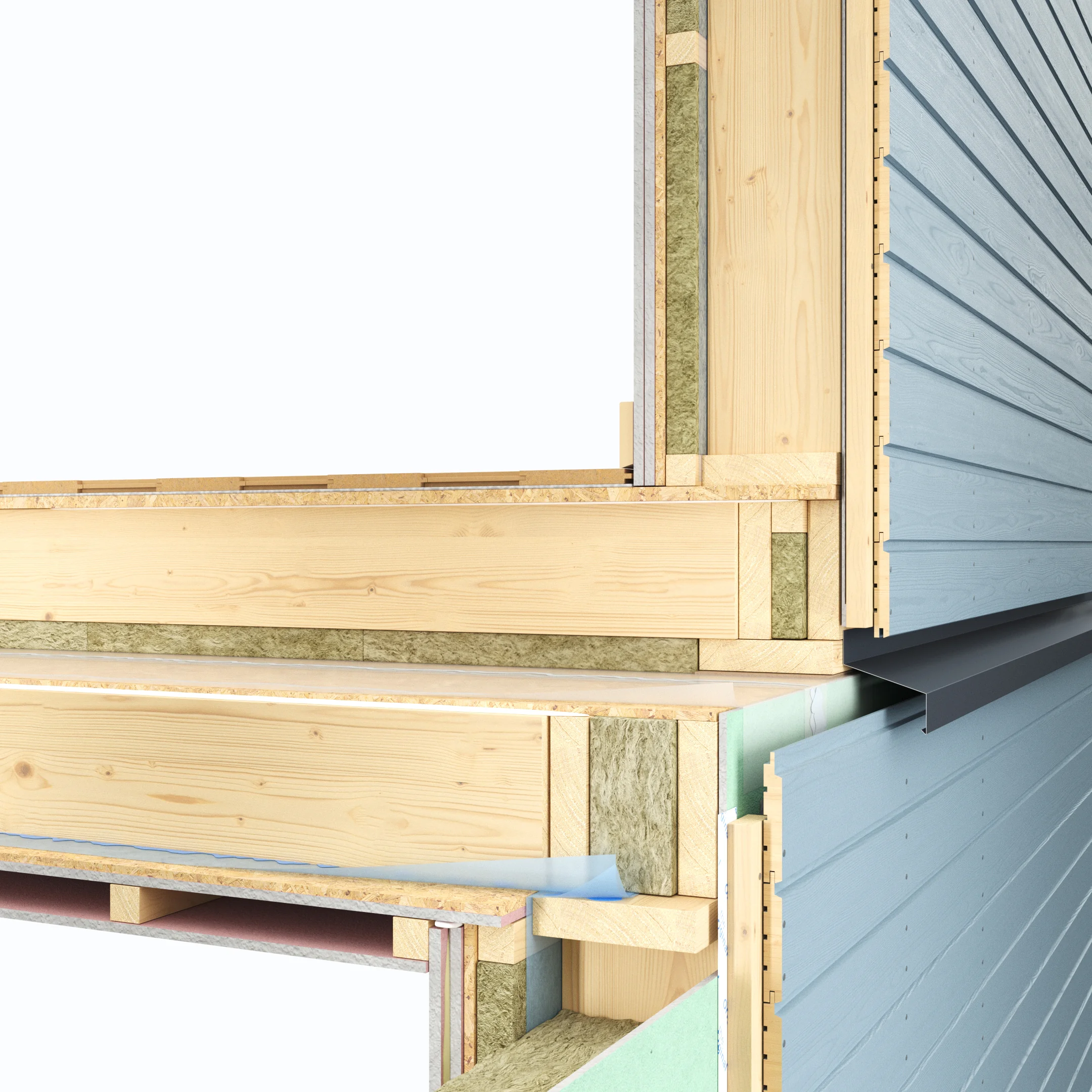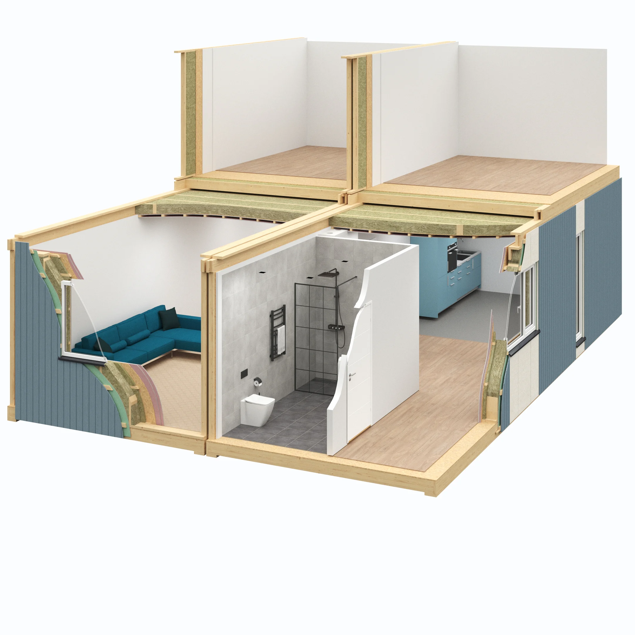 Als Nächstes widmen wir uns zentralen Konstruktionsfugen und den dazugehörigen Lösungen. Beim Verbinden von Platten empfiehlt es sich, die Fugenlösungen der Wolf Group für Wand- und Bodenpaneele zu prüfen, da Baumodule stabil, luftdicht und feuerbeständig sein müssen. Um diese Eigenschaften wirksam zu gewährleisten, sollten Klebstoffe und Dichtstoffe in Kombination mit mechanischen Befestigungselementen verwendet werden.